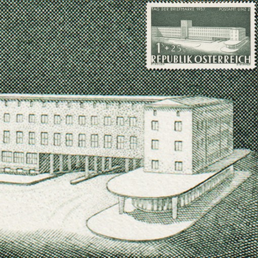 Znaczek przedstawia okazały urząd pocztowy w mieście Linz.