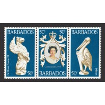 Na znaczkach widnieją kolejno: gryf Edwarda III, portret Elżbiety II oraz rzeźba pelikana brunatnego.