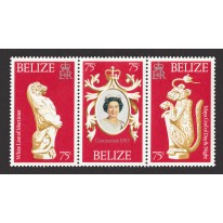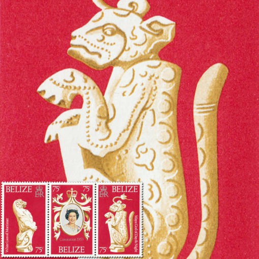 Na znaczkach widnieją kolejno: biały lew z Mortimer (rzeźba ta jest jedną z dziesięciu figur heraldycznych reprezentujących genealogię Elżbiety II wykonanych na okazję koronacji monarchini), portret Elżbiety II oraz rzeźba boga nocy i dnia Majów w postaci jaguara.