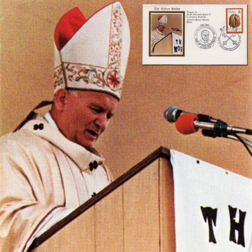 Pojedyncza koperta okolicznościowa celebrująca wizytę papieża Jana Pawła II w Belize podczas jego podróży do Kostaryki, Nikaragui, Panamy, Gwatemali, Salwadoru, Hondurasu, Belize i Haiti w dniach 2. - 10. marca 1983 roku.