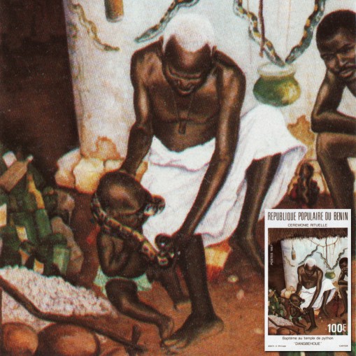 Znaczek przedstawiający jedną z rytualnych ceremonii zachodniej Afryki - chrzest w świątyni węży.