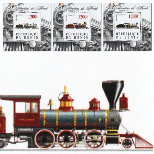 Nieautoryzowana seria w bloczkach, na znaczkach której widnieją lokomotywy parowe.