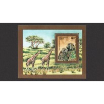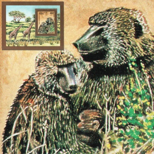 Znaczek w bloku, na którym widnieje pawian oliwkowy.