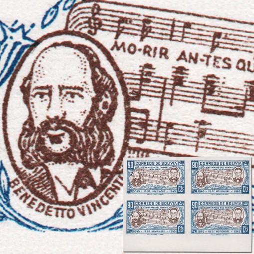 Znaczek w czwórce wydany jako część serii upamiętniającej dziesięciolecie istnienia boliwijskiego hymnu narodowego. Na znaczku widnieją jego twórcy.