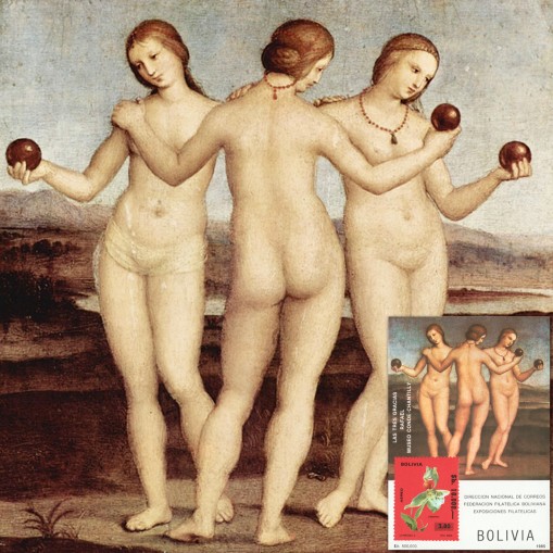 Na bloku przedstawiono reprodukcję obrazu „Trzy Gracje", namalowanego przez włoskiego malarza i architekta Rafaela (właśc. Raffaello Santi lub Raffaello Sanzio, 1483-1520).