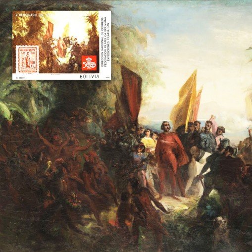 Blok upamiętniający 500-lecie odkrycia Ameryki. Na bloku przedstawiono obraz "Odkrycie Ameryki" Johanna Moritza Rugendasa oraz stary znaczek boliwijski.