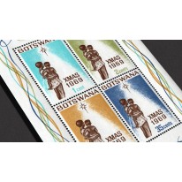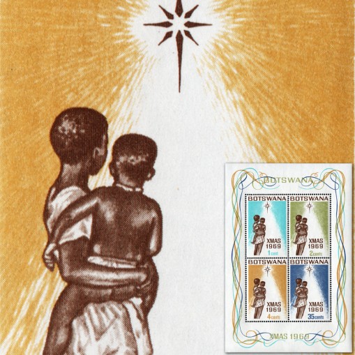 Na znaczkach widnieje kobieta z dzieckiem na rękach obserwująca gwiazdę betlejemską.