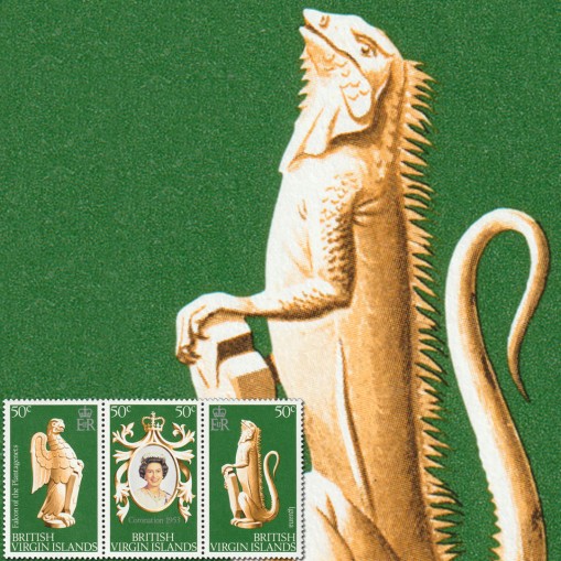 Na znaczkach widnieją kolejno: jastrząb z herbu rodu Plantagenetów (rzeźba ta jest jedną z dziesięciu figur heraldycznych reprezentujących genealogię Elżbiety II wykonanych na okazję koronacji monarchini), portret Elżbiety II oraz legwan.