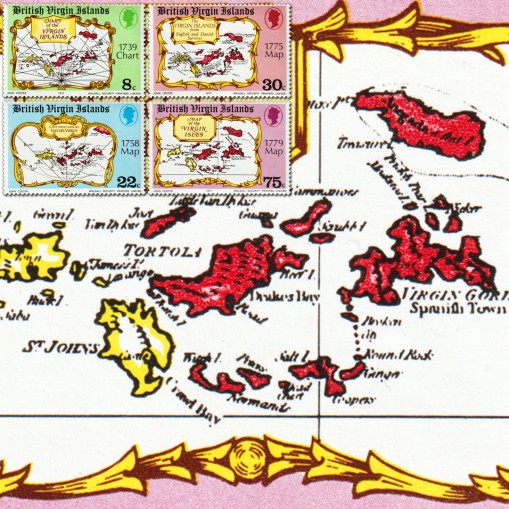 Na znaczkach przedstawiono osiemnastowieczne mapy Wysp Dziewiczych.
