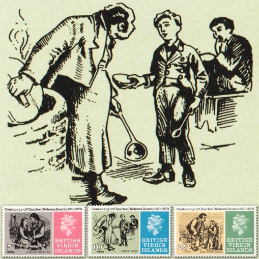 Na znaczkach widnieją sceny z jego powieści („Opowieść o dwóch miastach”, „Olivier Twist”, „Opowieść wigilijna”, „Wielkie nadzieje”).