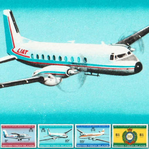Znaczki upamiętniające rozbudowę lotniska na Beef Island.