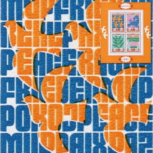 Na znaczkach widnieją gołąbki pokoju, gałązka laurowa i mapa Europy.