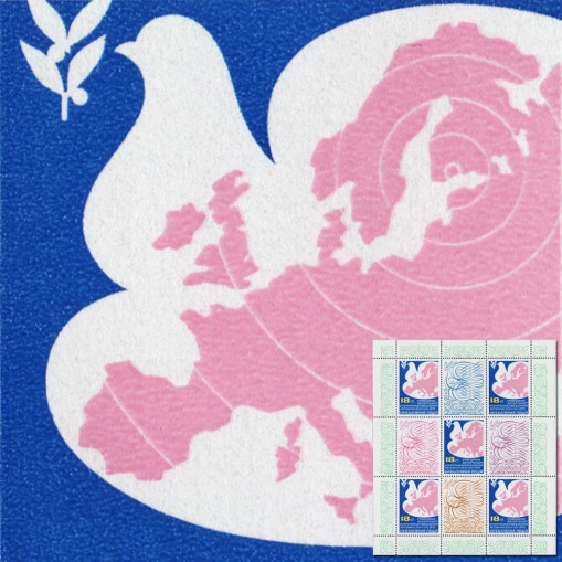 Na znaczku widnieją gołąbek pokoju i mapa Europy.