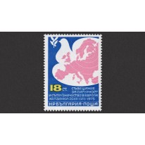 Na znaczku widnieją gołąbek pokoju i mapa Europy.