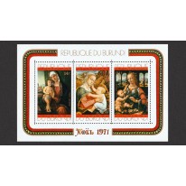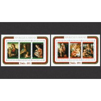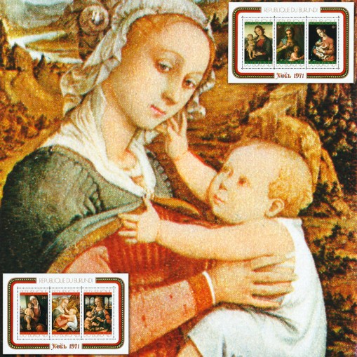 Na znaczkach widnieją reprodukcje dzieł malarstwa przedstawiających Madonnę z Dzieciątkiem autorstwa następujących artystów epoki renesansu: Pietro Perugino, Del Sarto, Moralesa, Da Conegliano, Fra Filippo Lippi i Leonarda da Vinci.