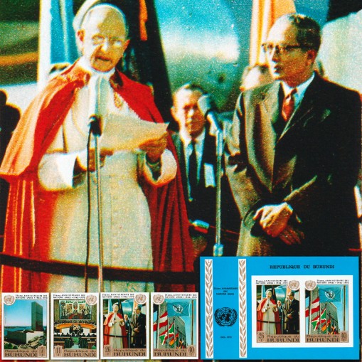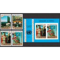 Na znaczkach przedstawiono siedzibę główną ONZ w Nowym Jorku, posiedzenie rady bezpieczeństwa, flagi państw członkowskich oraz papieża Pawła VI i sekretarza generalnego ONZ U Thant.