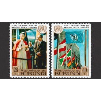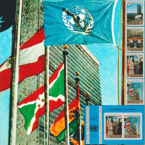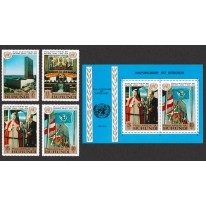 Na znaczkach przedstawiono siedzibę główną ONZ w Nowym Jorku, posiedzenie rady bezpieczeństwa, flagi państw członkowskich oraz papieża Pawła VI i sekretarza generalnego ONZ U Thant.