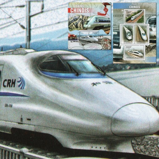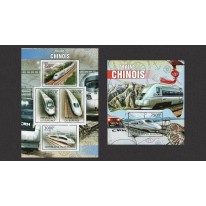 Seria w arkuszu i blok, na znaczkach których widnieją słynne pociągi chińskie, kolejno:
