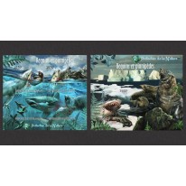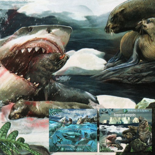 Seria w arkuszu i blok, na znaczkach których widnieją rekiny polujące na uchatki.
