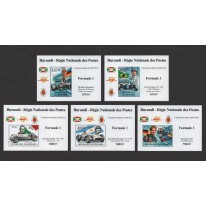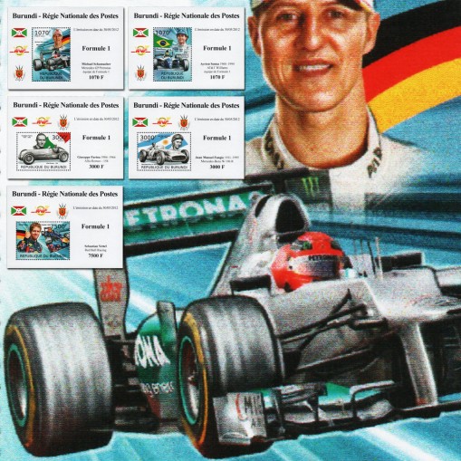 Seria w bloczkach, na znaczkach których widnieją samochody wyścigowe i ich kierowcy, kolejno: