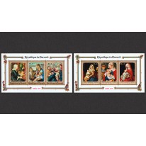 Na znaczkach widnieją reprodukcje dzieł malarstwa przedstawiających Świętą Rodzinę oraz Pokłon Trzech Króli autorstwa następujących artystów: Albrecht Dürer, Botticelli, El Greco, Velasquez, Van Cleve i Van der Weyden.