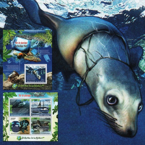 Seria w arkuszu i blok, na znaczkach których nagłośniono problem Wielkiej Pacyficznej Plamy Śmieci. Jest to olbrzymie dryfujące skupisko śmieci i plastikowych odpadów utworzone przez prądy oceaniczne w północnej części Oceanu Spokojnego między Kalifornią a Hawajami.