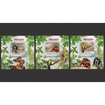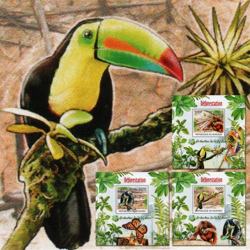 Trzy znaczki w blokach, na których widnieją następujące gatunki zwierząt cierpiące w powodu wylesiania: