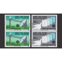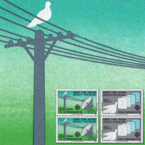 Na znaczkach widnieje linia telefoniczna i gołąbek pocztowy z listami.