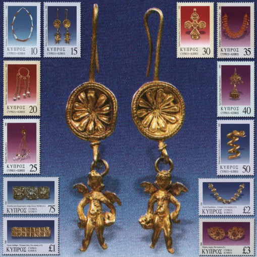 Seria obiegowa, na znaczkach której przedstawiono biżuterię: kolczyki, naszyjniki, wisiorki i bransolety z okresu starożytności do XIX wieku.