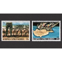 Na znaczkach widnieje drut kolczasty i płonąca północna część mapy Cypru.