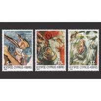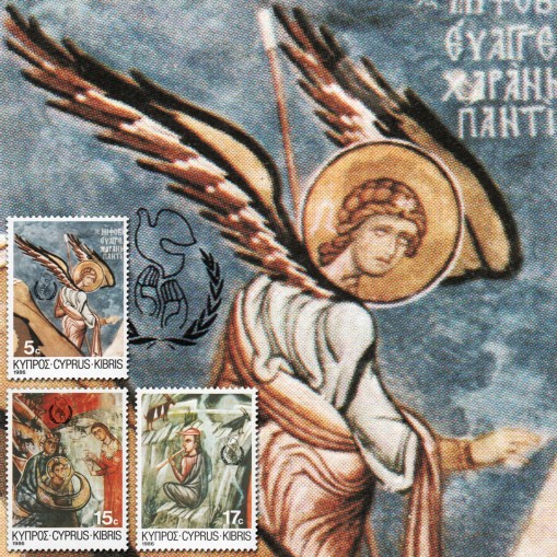 Na znaczkach widnieją freski z cypryjskich kościołów przedstawiające narodziny Chrystusa.