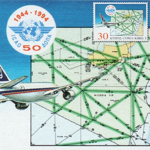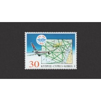 Na znaczku widnieje mapa połączeń lotniczych na Cypr i samolot.