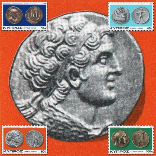 Seria, na znaczkach której widnieją starożytne monety kolejno: