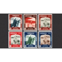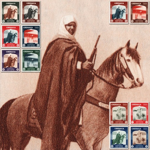 Na znaczkach widnieje jeździec arabski na koniu, przylot samolotu transportującego pocztę Caproni Ca 101, rzeźba Wenus z Cyreny i samolot Caproni Ca 101.