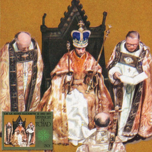 Na znaczkach widnieje ceremonia koronacji monarchini.