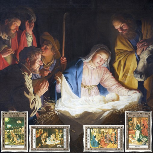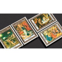 Na znaczkach widnieją reprodukcje dzieł malarstwa o tematyce bożonarodzeniowej: