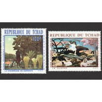 Na znaczkach widnieją reprodukcje obrazów Henriego Rousseau: „Zaklinacz Węży” i „Wojna”.