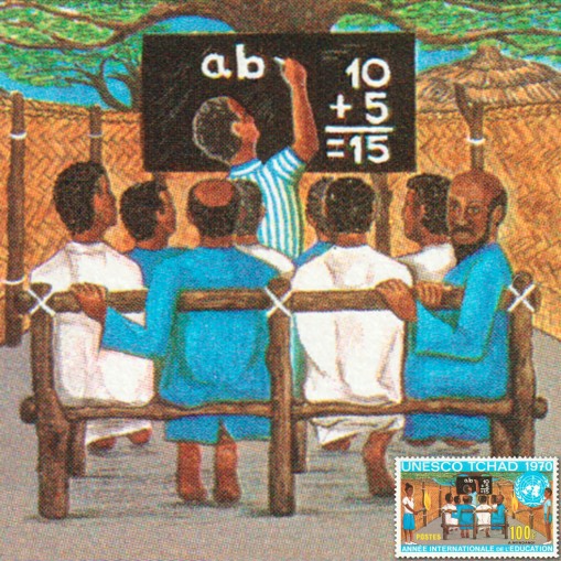 Edukacja podstawowa a Afryce dotyczy często ludzi starszych, jak widać na znaczku.