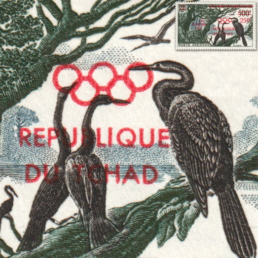 Znaczek wydany pierwotnie we Francuskiej Afryce Równikowej w 1953 roku, tym razem z przedrukiem nominału i nadrukiem „XVIIe OLYMPIADE 1960 REPUBLIQUE DU TCHAD 250F” promującym Igrzyska Olimpijskie w Rzymie.