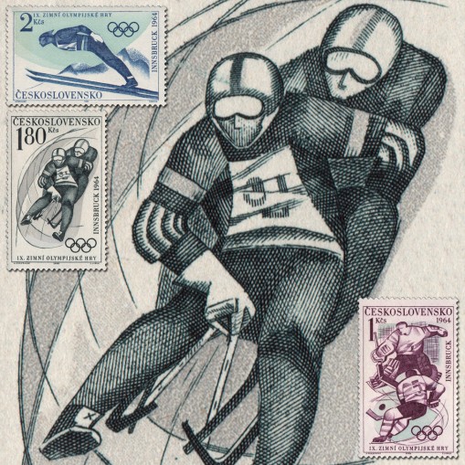 Na znaczkach widnieje hokej na lodzie, saneczkarstwo i skoki narciarskie.