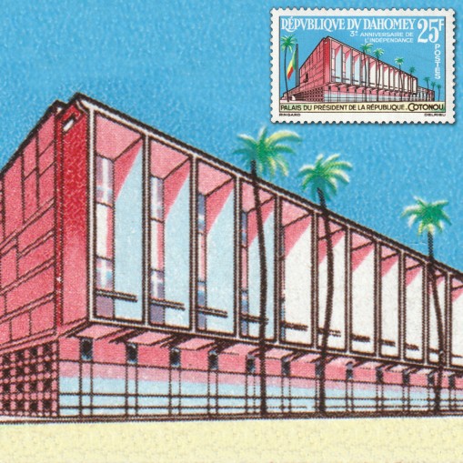 Znaczek wydany z okazji 3. rocznicy uzyskania niepodległości przez Dahomej, przedstawiający pałac prezydencki w Kotonu.