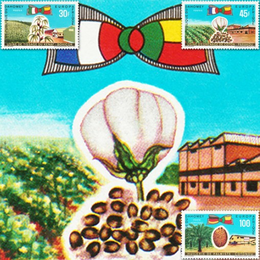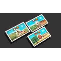 Na znaczkach przedstawiono pola uprawne ketmii konopiowatej (kenafu), bawełny oraz kokosów.