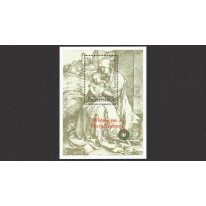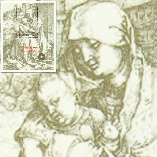 Na znaczku widnieje rycina Albrechta Dürera przedstawiająca Marię z Dzieciątkiem siedzącą pod ścianą.