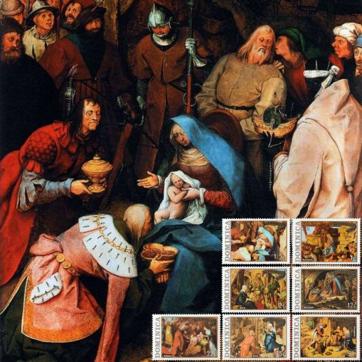 Na znaczkach widnieją reprodukcje dzieł malarstwa przedstawiające pokłon trzech króli autorstwa następujących artystów epoki renesansu: Pietera Brueghela starszego, Sandro Botticelliego, Albrechta Dürera, Petera Paula Rubensa i Giorgione.