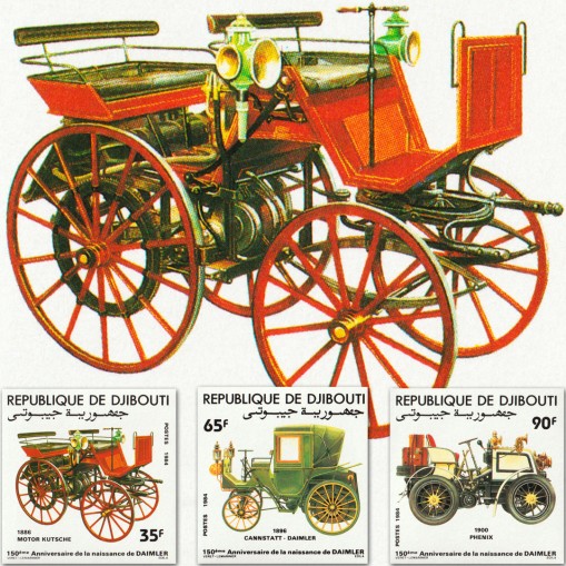 Znaczki upamiętniające 150. rocznicę urodzin Gottlieba Daimlera, niemieckiego inżyniera, konstruktora i przemysłowca. Wspólnie z Wilhelmem Maybachem zbudował jednocylindrowy czterosuwowy silnik spalinowy, a jako paliwo zastosowali benzynę.