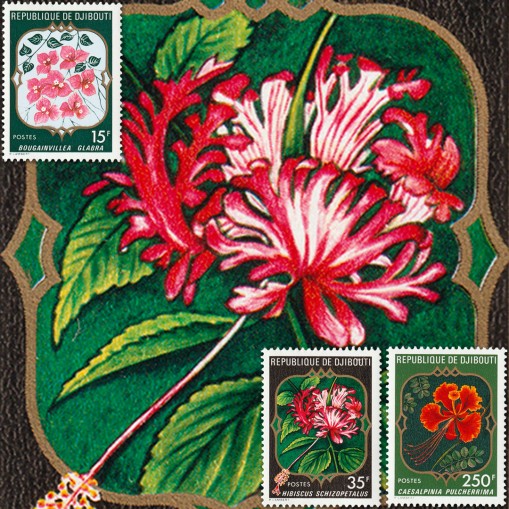 Na znaczkach przedstawiono kwiaty występujące w tamtych regionach świata: bugenwillę gładką, kwiat pawi oraz hibiskus Afryki (ten ostatni nazywany jest kwiatem pająkiem).