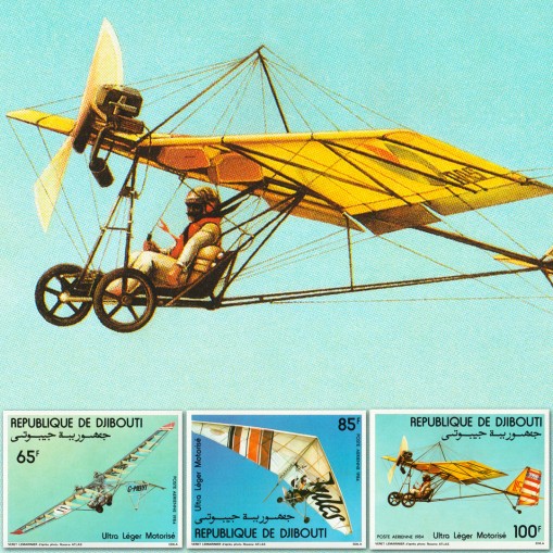 Na znaczkach przedstawiono ultralekkie samoloty i lotnię „Jules”.
