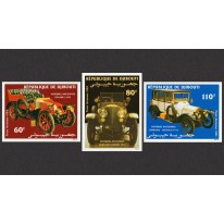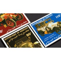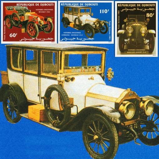 Na znaczkach przedstawiono wczesne modele samochodów, kolejno: