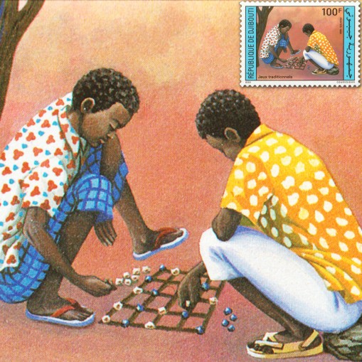 Na znaczku widnieją chłopcy grający w go.