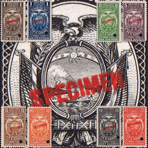 Znaczki zostały urzędowo przedziurkowane oraz umieszczono na nich nadruk „SPECIMEN", czyli przygotowano je do wykorzystania jako wzorce dla urzędników ekwadorskich, którzy mogli w ten sposób porównać znaczek na dokumencie z oryginałem. Było to istotnym, ponieważ oryginalne znaczki były używane, gdy trzeba było pobierać różne podatki skarbowe lub opłaty urzędowe (stąd napis „TIMBRE FISCAL" na znaczkach).